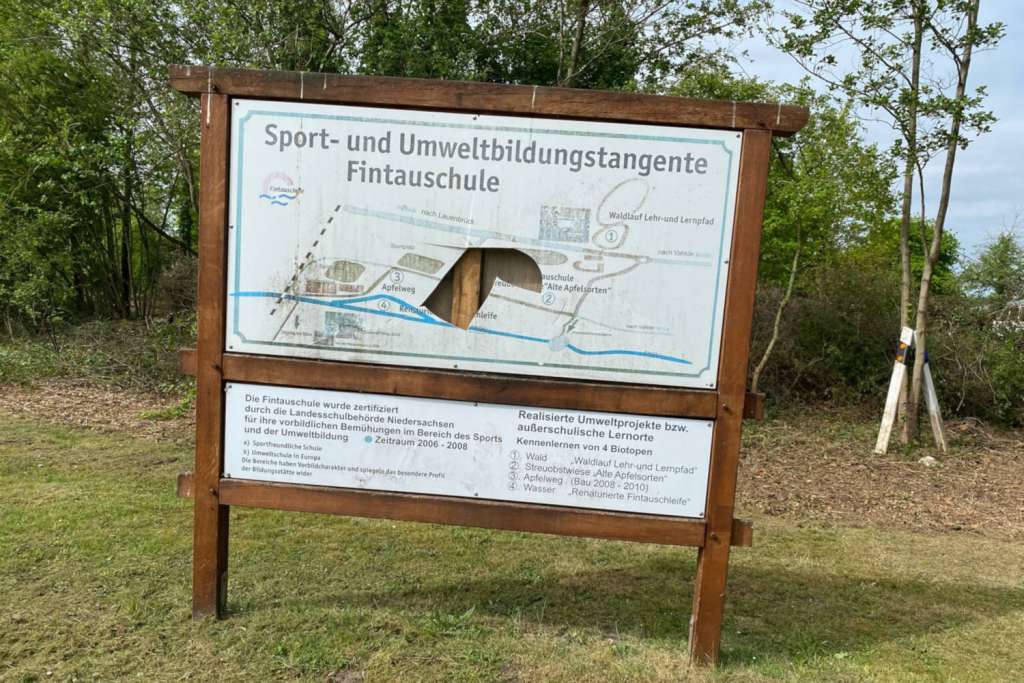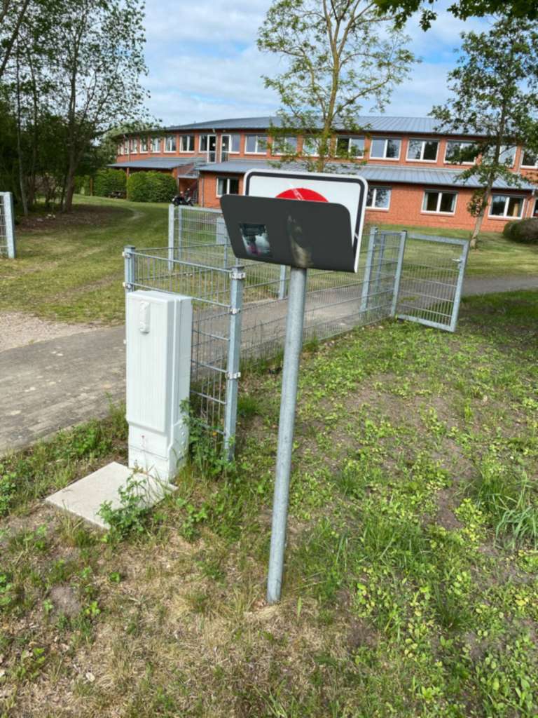 Beschädigtes Schild vor der Schule