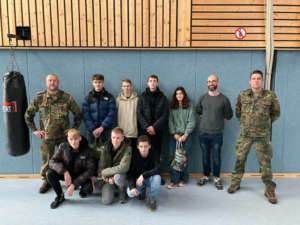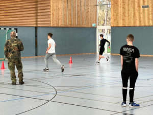 Regierungsamtmann Glasgow erzählte zunächst in einem Vortrag über die verschiedenen Möglichkeiten der Bundeswehr. Er zeigte Videos und diskutiere mit den Schülerinnen und Schülern über verschiedene Zugangsvoraussetzungen und Zukunftsperspektiven in der Bundeswehr. Im Anschluss fand ein Sporttest nach den Vorgaben der Einstellung statt. Wir danken der Bundeswehr und im Besonderen der Karriereberatung für die Möglichkeit.