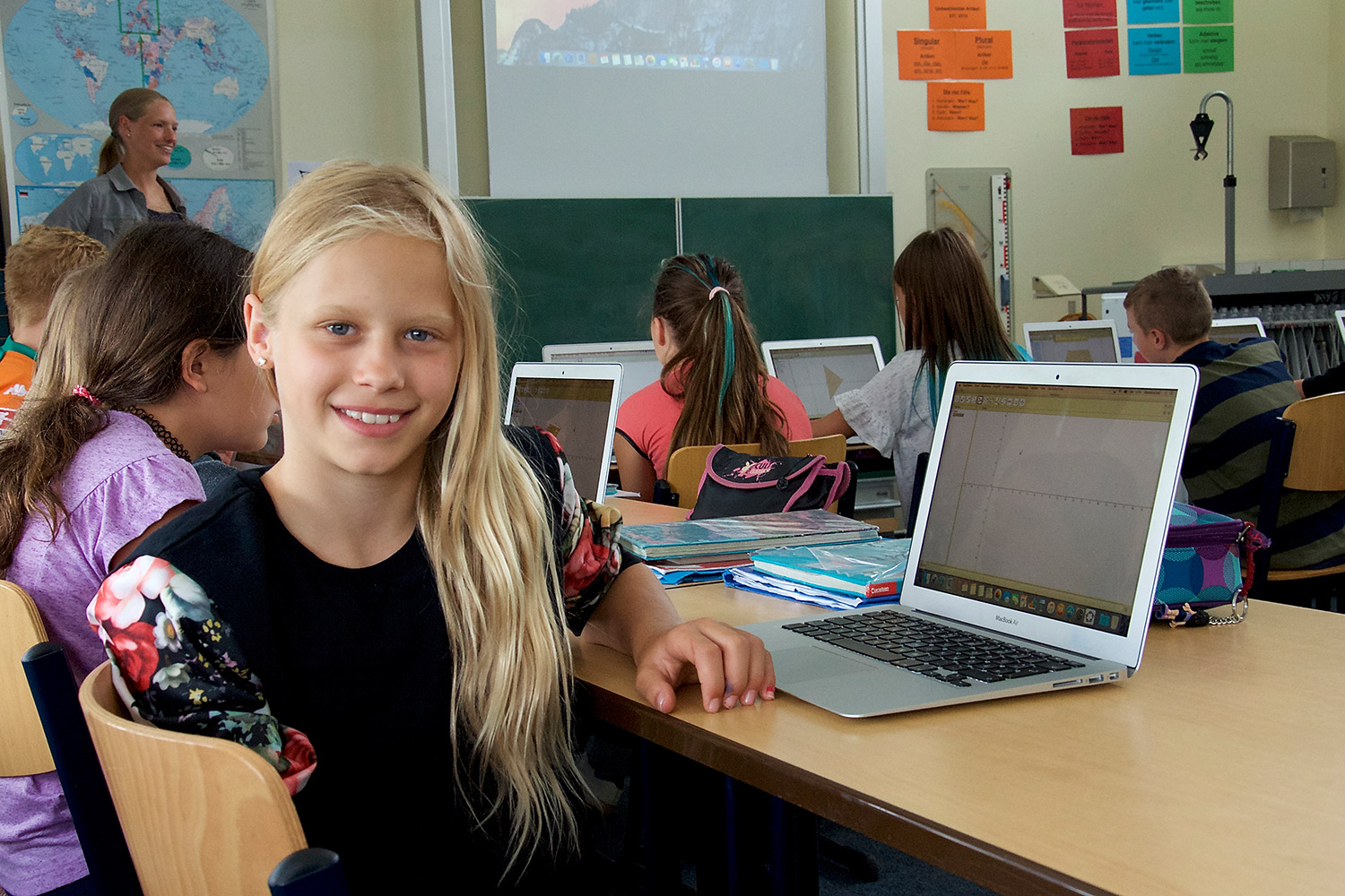 Die meiste Zeit verbringen wir im Klassenraum. Mathe, Englisch, Deutsch, aber auch andere Fächer wie Geschichte und Erdkunde oder Religion finden hier statt. Manchmal arbeiten wir mit den Laptops. Aber noch nicht so oft wie die größeren Schüler.