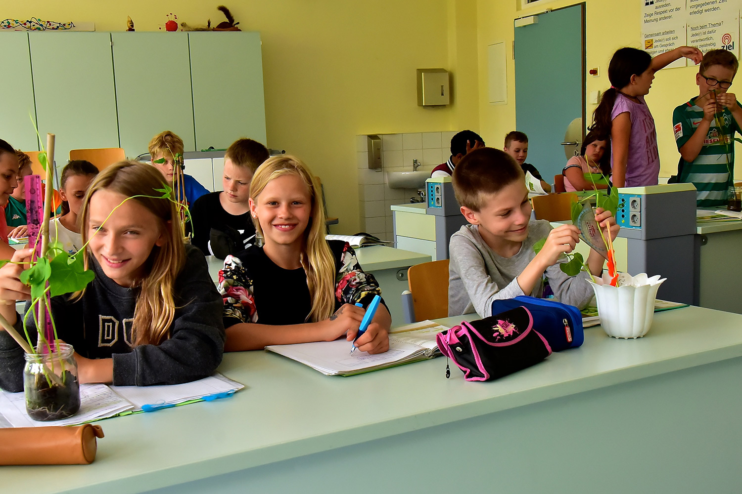 Viele Fächer finden in den Fachräumen statt. Hier haben wir gerade Biologie und messen, wie sehr unsere selbst gepflanzten Bohnen gewachsen sind.