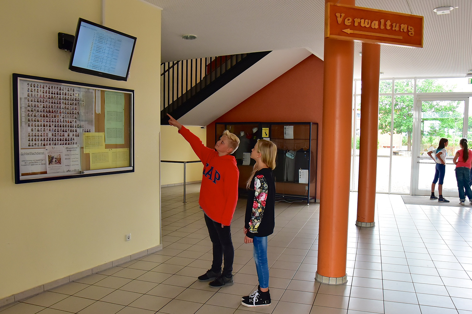 Man kann in der Pause oder nach Schulschluss auch schon auf dem Vertretungsplan nachschauen, welcher Unterricht morgen stattfindet. Das kann man aber auch Zuhause im Internet machen.