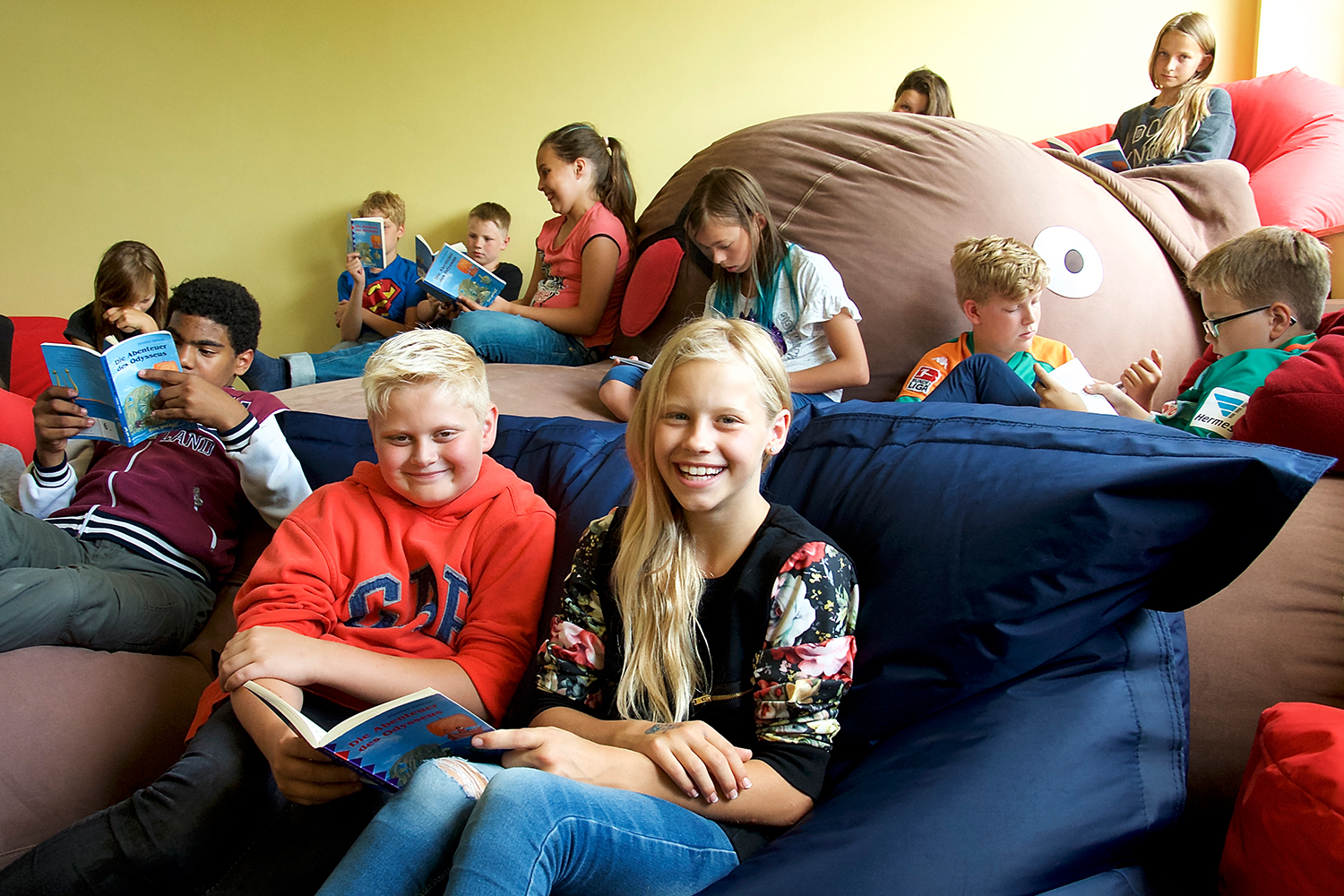 Manchmal gehen wir auch in den Chillout-Raum. Auf dem großen Hasen und den vielen Sitzkissen kann man richtig gut lesen – und manchmal auch faulenzen.
